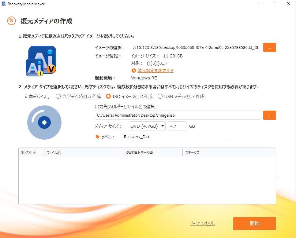 対象マシン専用のリカバリーイメージを組み込んだディザスターリカバリー用メディアの作成をおこないます。メディアは、DVD/Blu-ray、USB HDD、USBメモリと各種メディアをサポートしています。リカバリーメディア単体で復元できるため、たとえば復元時にネットワークが使用できず共有フォルダーやNASに接続できない場合やUSBメディアが持ちこめない現場でもすぐに復元が可能です。