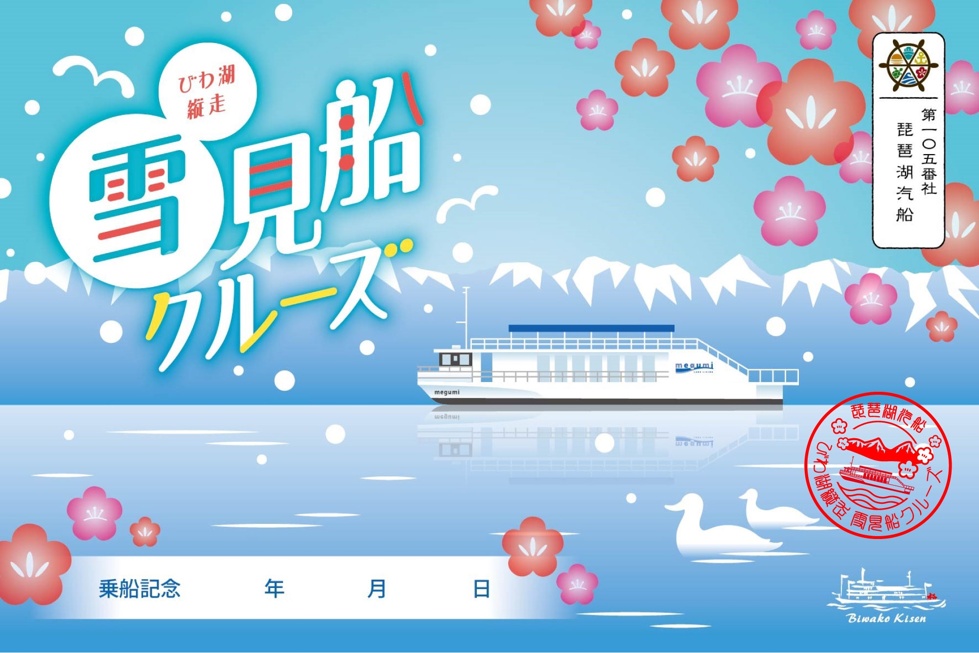 美しく雪化粧をした比良山系や、湖面にゆったりと浮かぶ水鳥、湖北の春の風物詩「長浜盆梅展」にちなんだ梅のあしらいなど、「雪見船クルーズ」の魅力をギュッと詰め込んだデザインに仕上げました!