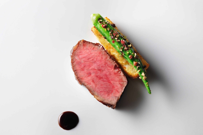 牛肉を炭火でじっくりと焼き上げ、ジャガイモと、ヒバの香りを纏った旬のオクラを添えた一皿です。牛肉にはマデラ酒をふんだんに使用したソースを合わせました。柔らかくなるまでしっとりと火を入れたオクラは、ジャガイモの食感とぴったりと調和します。肉の熟成感、炭火の香り、ヒバの香りが重なり合い、複雑な香りと味わいを楽しめます。