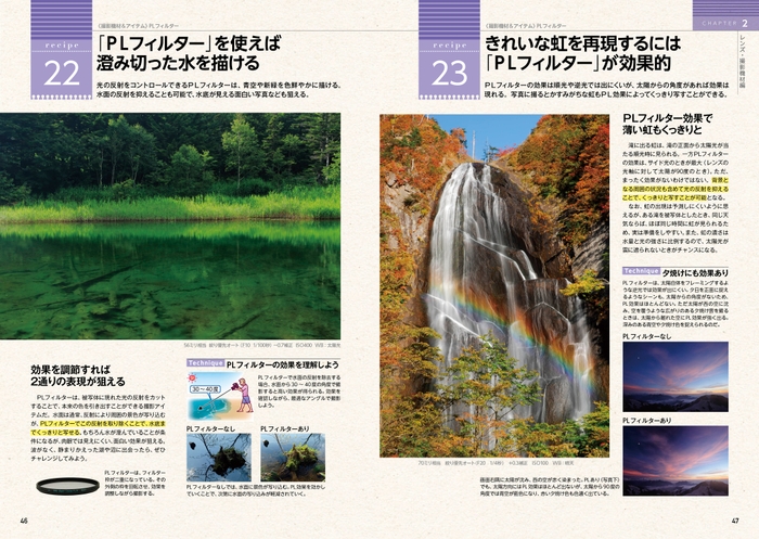 カメラ機能編では、シャッター速度やホワイトバランス、色味の仕上がり設定などの調整で撮ることが出来る14の撮影レシピを紹介。レンズ・撮影機能編では、広角/望遠/超望遠/マクロなどそれぞれのレンズならではの撮影レシピと、PLフィルター/NDフィルター/フラッシュなどを使用する23の撮影レシピを紹介しています。