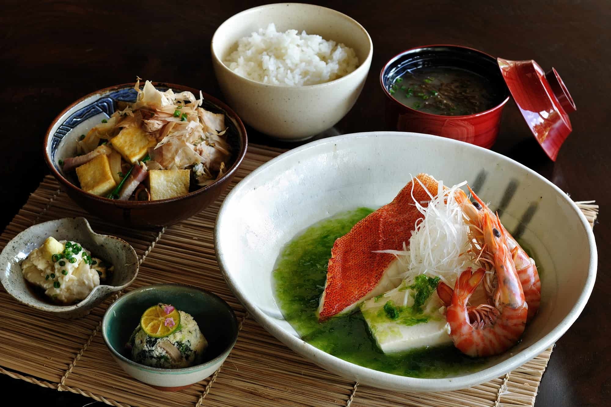 夕食に、八重山近海で獲れた魚の「マース煮」を提供します。マースとは島の方言で塩を意味し、マース煮は魚を塩と泡盛だけで味付けすることによって、素材本来の味を引き出す沖縄の伝統料理です。素材の旨味を活かしたあっさりした味わいで、沖縄では子どもからお年寄りまで家庭の味として親しまれています。調理に使用する具材の豆腐と味付けの塩は、どちらも自身で手づくりしたものです。島の美しい海が育んだ恵みを味わい、心もお腹も満たされます。