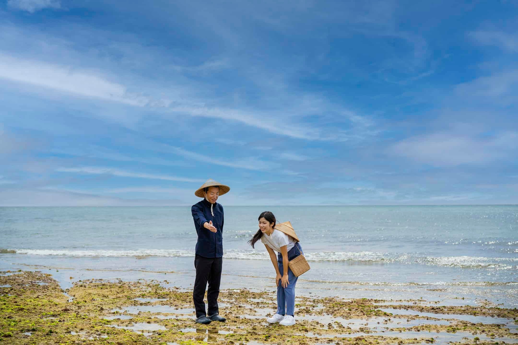島で生まれ育った海人と一緒に、海辺や浜の岩場に生息する生物や目にする景色の豆知識などを知りながら歩く「竹富島シートレッキング」を体験します。生物の名前を知るだけにとどまらず、竹富島の海のもとで育った海人だからこそ知っている、島の暮らしと海との関わり方を聞くことができます。ひとりで海辺を散歩するだけでは分からない自然環境にまつわる話を知り好奇心が刺激され、海の魅力を体感できるアクティビティです。透き通る海を眺め心地よく身体を動かしながら、竹富島の海を楽しめます。