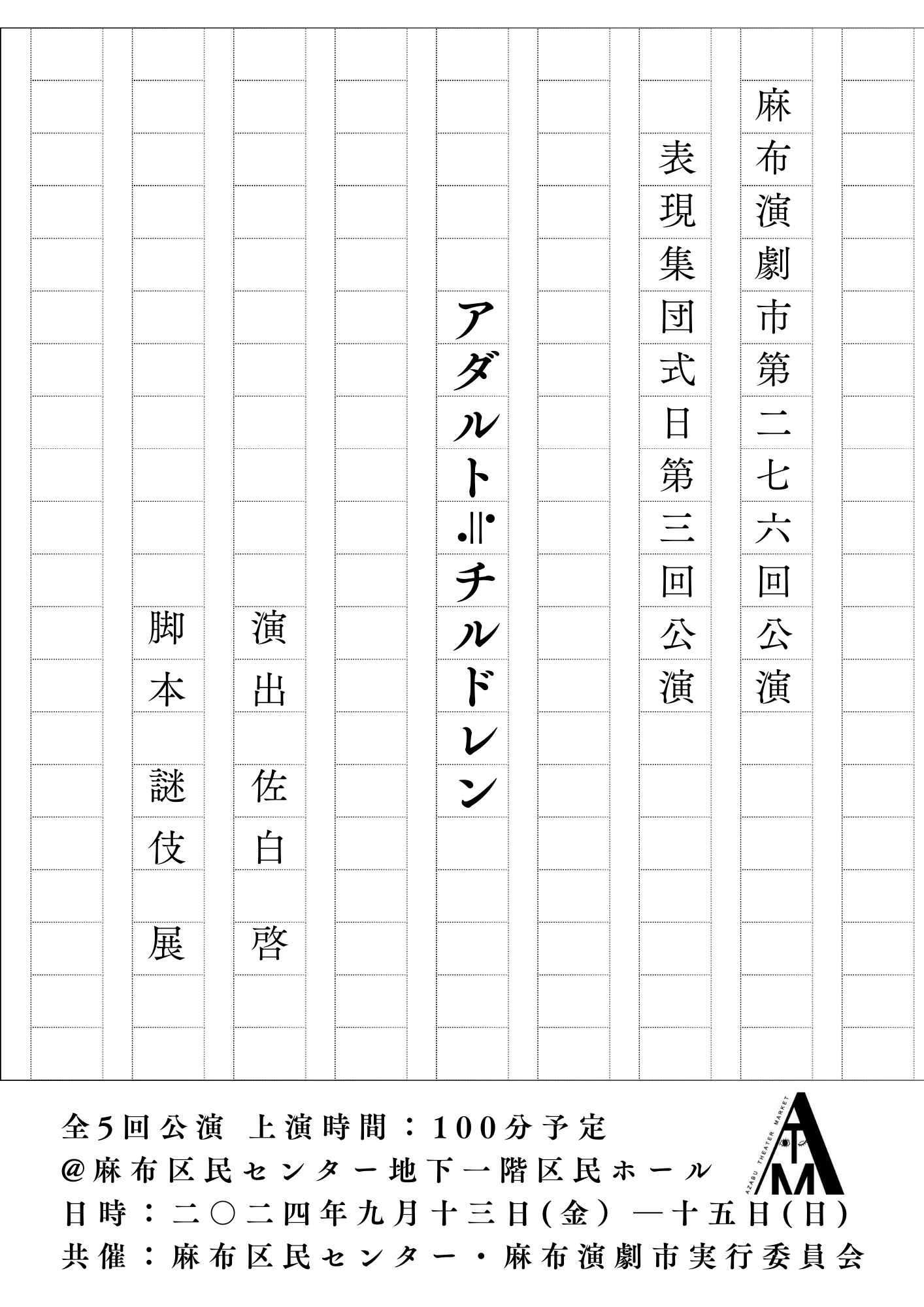 表現集団式日(代表:佐白啓)主催、『アダルト≒チルドレン』が2024年9月13日 (金) ~2024年9月15日 (日)に麻布区民センター 区民ホールにて上演されます。チケットはカンフェティ(運営:ロングランプランニング株式会社、東京都新宿区、代表取締役:榑松 大剛)にて発売中です。