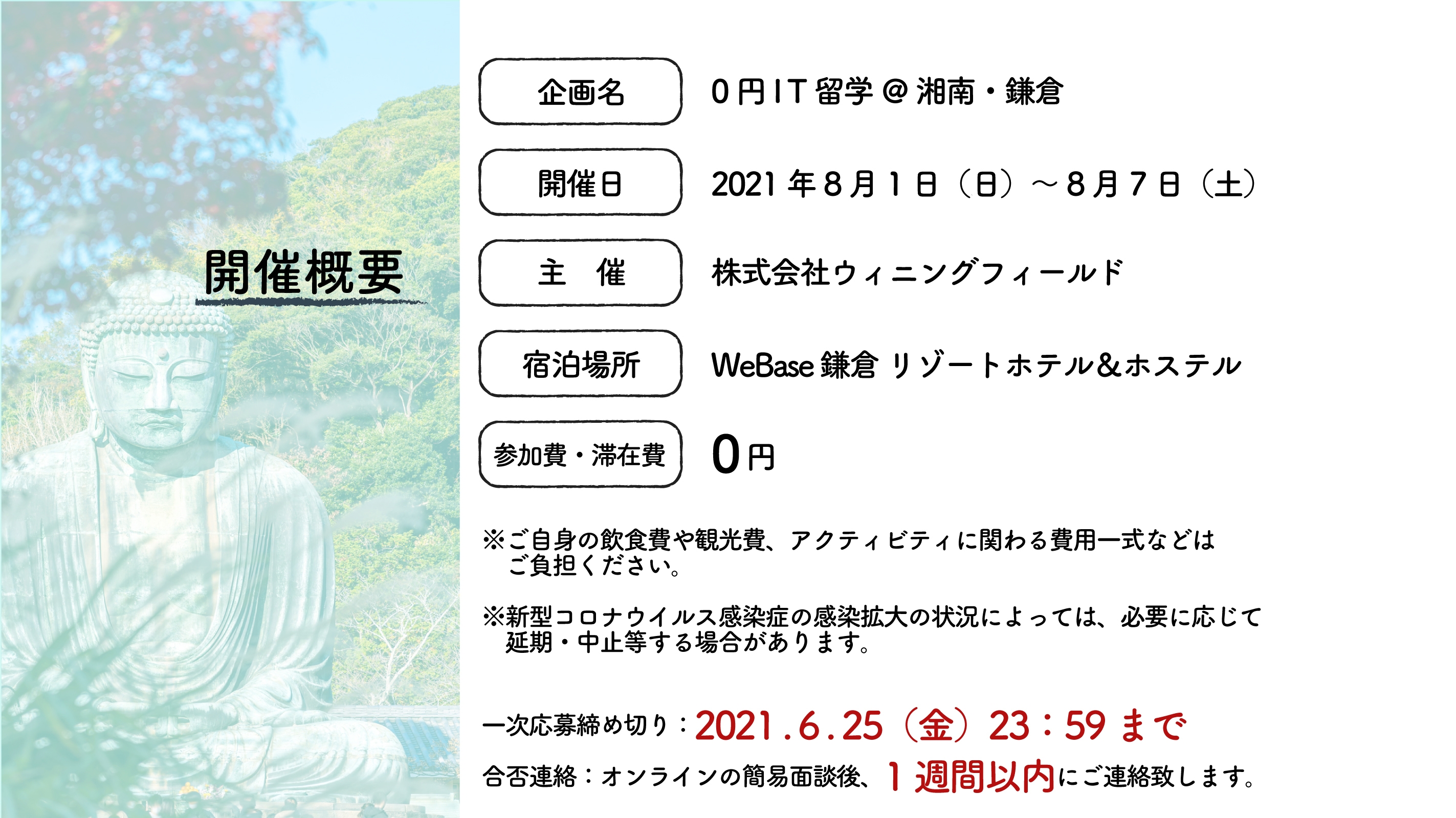 株式会社ウィニングフィールド(本社:神奈川県鎌倉市、代表取締役:勝原 潤)は、コロナ禍で職を失って困窮している、働きがい、生きがいを模索中の将来に悩んでいる20代若者に向けて、「湘南・鎌倉のシェアハウスに滞在しながら、IT・Webのマーケティングのスキルを身につけてもらい、自身の将来のキャリアアップや転職、Webを活用して収入、収益を得てほしい」という想いから、『0円で学べるIT留学講座』を2021年8月に開催いたします。