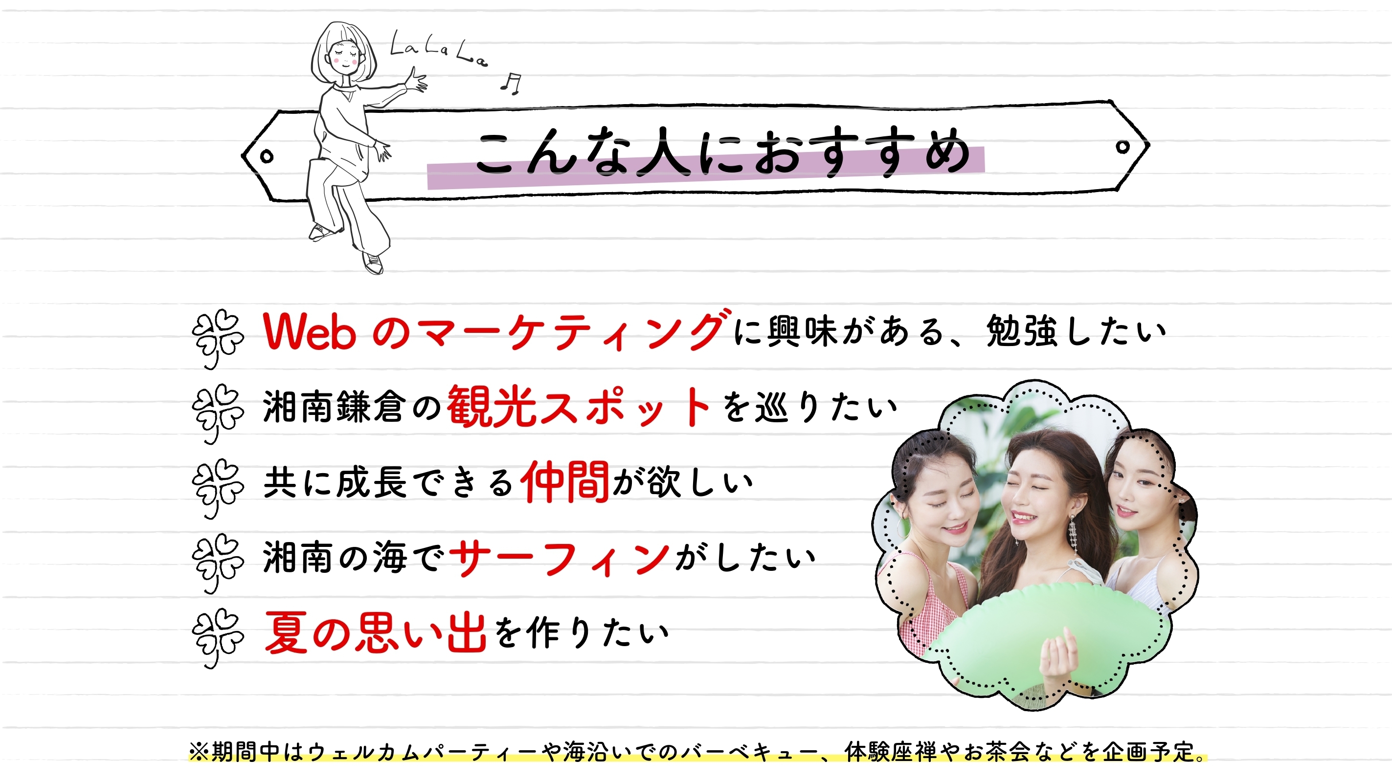 また、空いた時間には湘南・鎌倉のおしゃれなお店や自然、観光などを楽しんでステキな夏を満喫していただきます。生涯価値の高いWebマーケティングを実践的に学びながら、湘南・鎌倉で素敵な夏の想い出を作ることができます。