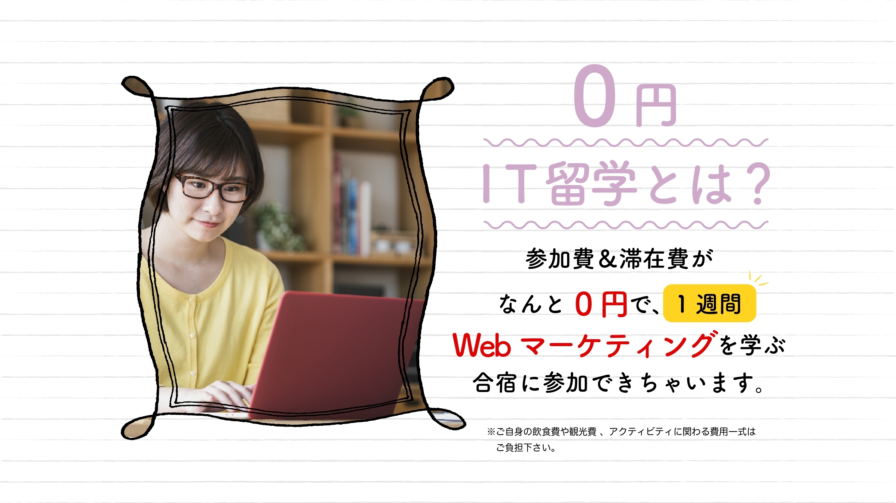 参加費&滞在費を0円で、1週間ITやWebのマーケティングについて学んでいただく合宿です。「Webマーケティングという存在と認知をもっと広めたい」「コロナ禍で職を失った方や、転職を考えている方のキャリアアップのきっかけにつなげてほしい」という想いから発足いたしました。
