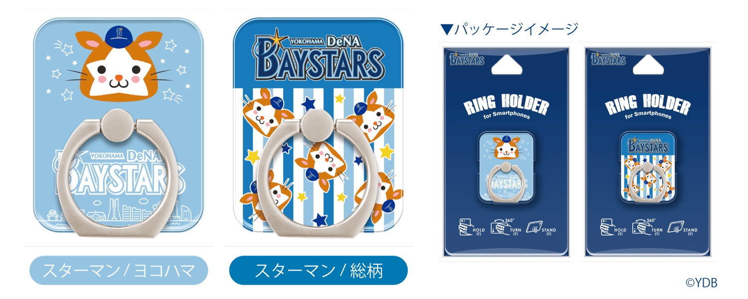 横浜DeNAベイスターズデザインのリングホルダーです。スマートフォン本体やケースの背面に貼り付けることで、端末の持ちやすさがアップ。落下防止の役割も果たしてくれます。360度回転するリングは動画視聴などに便利なスタンドとして使用も可能です。