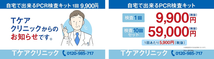 「全国どこでもご自宅で・唾液採取のみ・結果はメールでお知らせ」と非常に便利なTケアクリニックのPCR検査キット(宅配)が、1回9,900円、10回セット59,000円(1回あたり5,900円)※1 にて提供されることを訴求した内容となっております。