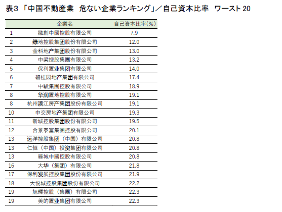 表3 「中国不動産業 危ない企業ランキング」/自己資本比率 ワースト20
