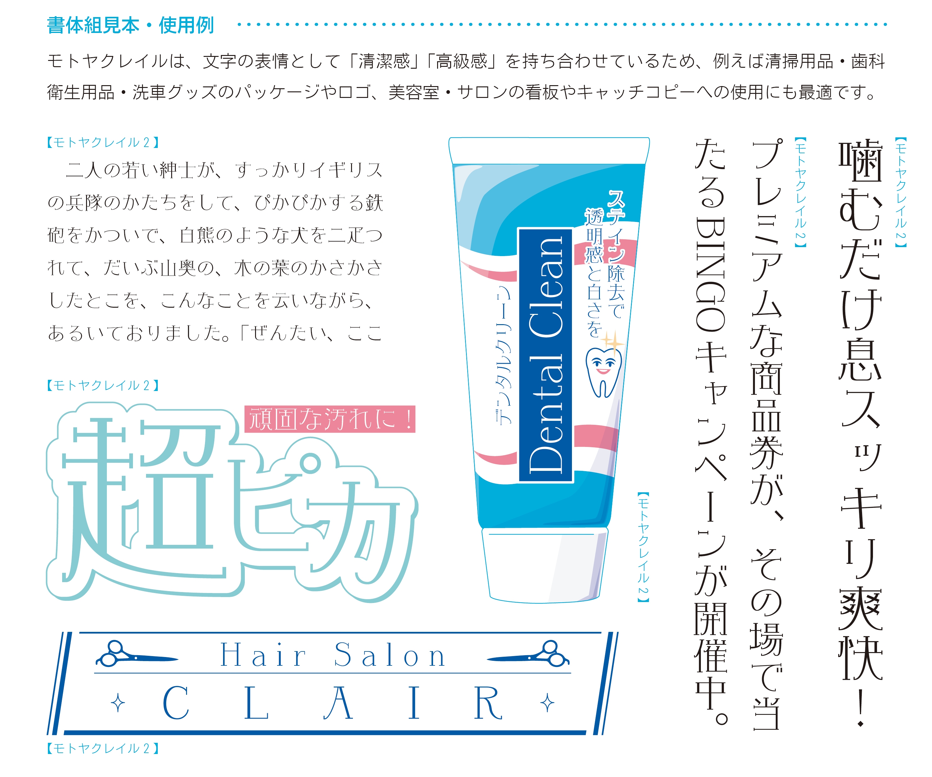 「モトヤクレイル」は、文字の表情として「清潔感」「高級感」を持ち合わせているため、例えば清掃用品・歯科衛生用品・洗車グッズのパッケージやロゴ、美容室・サロンの看板やキャッチコピーへの使用にも最適です。