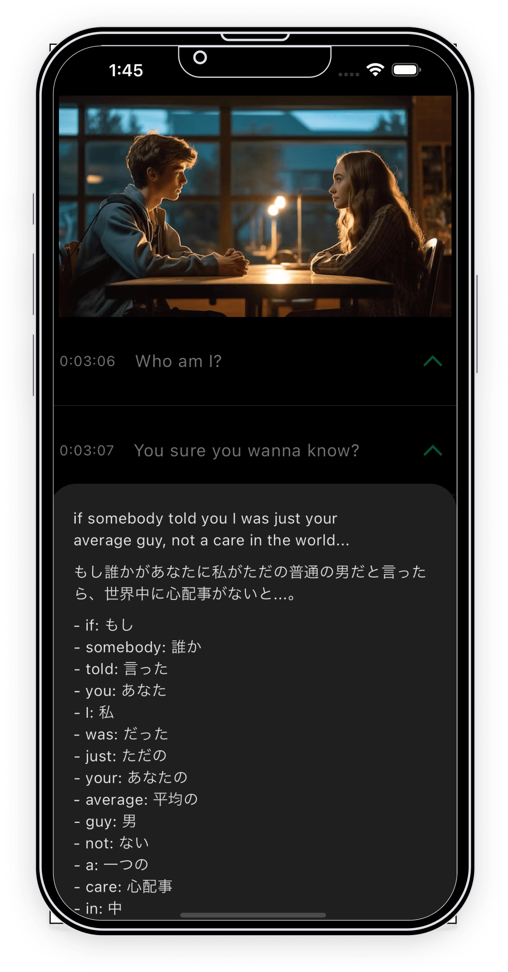 特に英語学習にフォーカスしたこのアプリは、英語字幕の表示、AIによる日本語訳、英単語の辞書機能など、豊富な機能を無料で提供します。