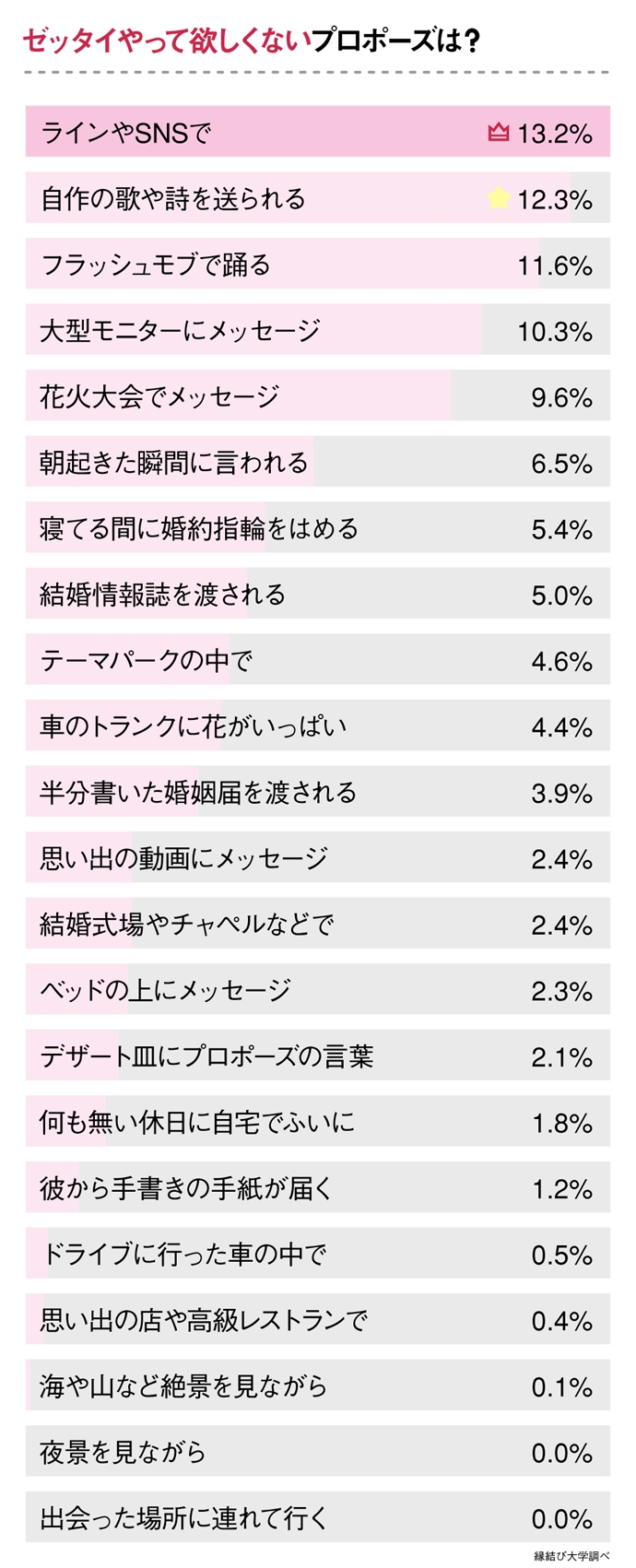 逆に「ゼッタイにやって欲しくない」プロポーズについても調査しました。最も多かったのは「ラインやSNSでプロポーズの言葉が送られてくる」でした。「自作の歌や詩を送られる」も女性からは不評です。