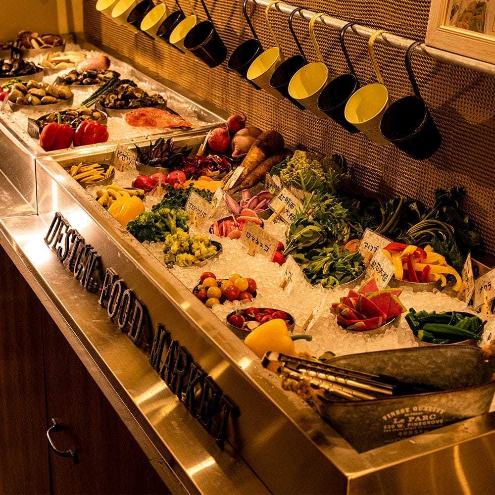 店内に併設された「素材マーケット」には、こだわりのお肉や新鮮な魚介など、生産者から毎日届くとっておきの食材を豊富に取り揃えています。自社農園で心を込めて育てた野菜や、契約農家から届く栄養たっぷりの有機野菜は常時10種類以上ご用意。お好みの食材を見て、選んで、楽しめる、新感覚バルです。「焼きたてローストビーフ」や「バケツ盛り放題バーニャ」など、「肉バルvs魚バル」をコンセプトにした多種多様なお料理を、遊び心溢れる個室でお楽しみいただけます。