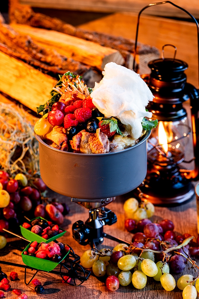 数種のベリーにぶどう、柑橘系果実を使用した「フルーツ鍋」。さらに、日替わりで5種のキノコに野菜、鶏肉も一緒に楽しめる栄養満点の鍋です。スープには自家製の味噌ベースの出汁を使用。ふんわり綿あめがほんのり甘みとコクを際立たせ、ベリーの程良い酸味と甘みがアクセントに…。あと引くおいしさに仕上がっています。ブラックペッパーをたっぷりふって味変を楽しむのもおすすめです。
