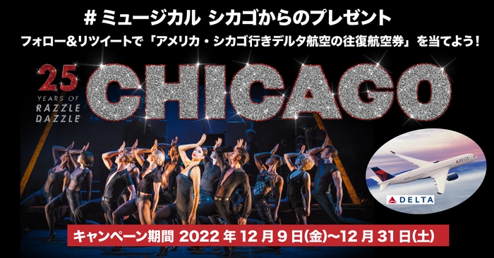 そして、ブロードウェイミュージカル『シカゴ』の25周年を記念し、キョードー東京Twitterをフォロー&リツイートいただいた方の中から「アメリカ・シカゴ行きデルタ航空の往復航空券」が抽選で2名様に当たるキャンペーンを開催いたします。