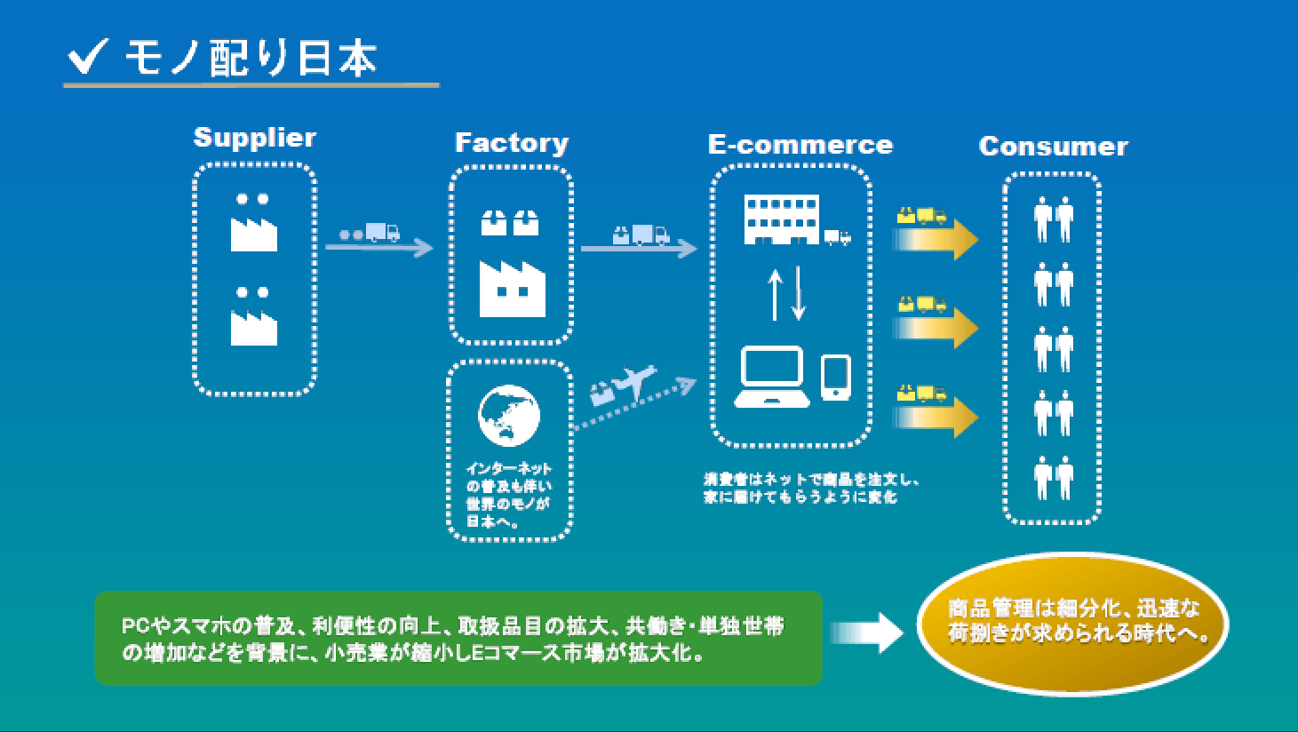 ECの普及拡大により、商品は「小売店舗に置かれており、購入のため消費者が取りに行くもの」から「物流倉庫に保管されており、注文した消費者へ配達されるもの」へ変わりつつあります。この傾向は新型コロナウイルスの感染拡大により加速しています。