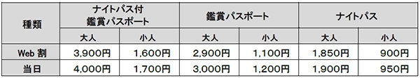 上記ナイトパスまたはナイトパス付鑑賞パスポートのとおり