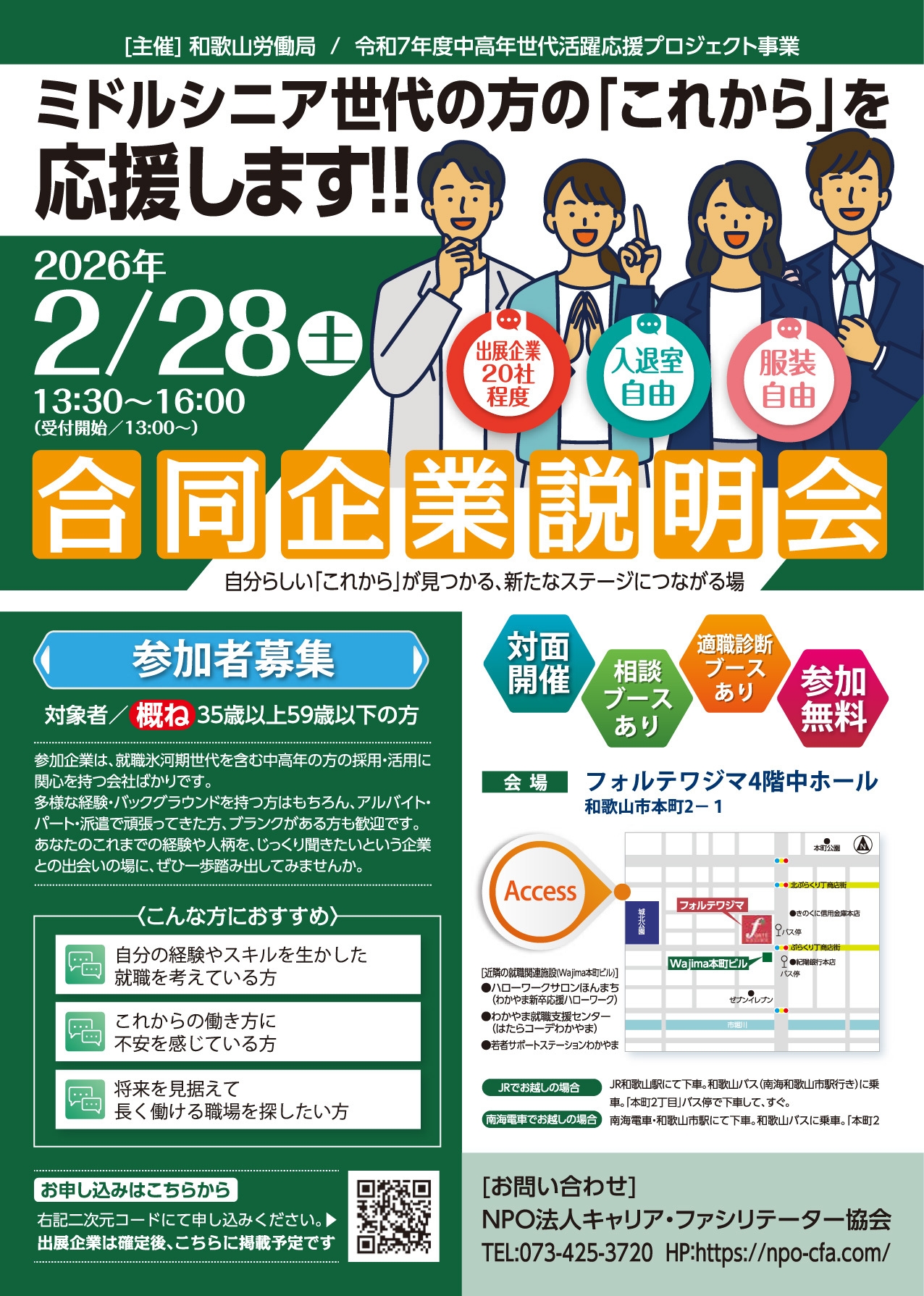 和歌山労働局は、令和7年度中高年世代活躍応援プロジェクト事業の一環として、ミドルシニア世代を対象とした「合同企業説明会」を、2026年2月28日(土)にフォルテワジマ4階(和歌山市)にて開催します。