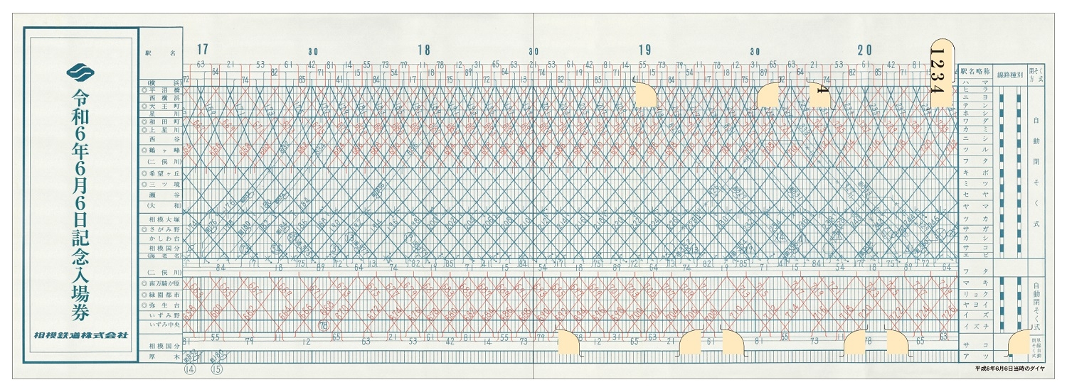 記念入場券の中面には「6」にちなみ、昭和・平成の相鉄線を駆け抜けた「6000系」電車(1961年に登場)と「6000系試作車モハ6021」電車(1967年に登場)、そして「新6000系」電車(1970年に登場)の紹介文が記載されています。また表紙は、平成6年6月6日当時に乗務員などが携帯していた、相鉄いずみ野線 いずみ中央駅が終点の「列車運行図表(ダイヤ図)」をモチーフにしたデザインとしています。