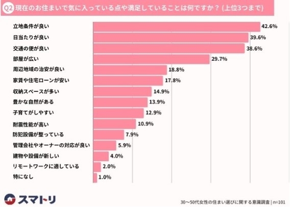 「Q2. 現在のお住まいで気に入っている点や満足していることは何ですか? (上位3つまで)」と質問したところ、「立地条件が良い」が42.6%、次いで「日当たりが良い」が39.6%という回答になりました。