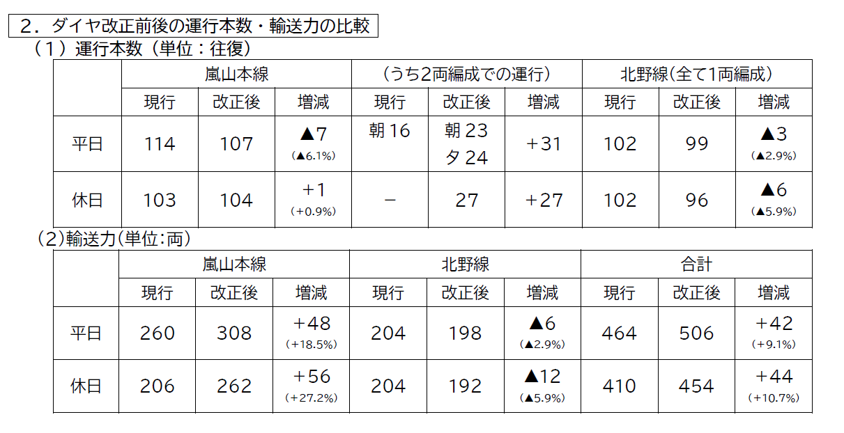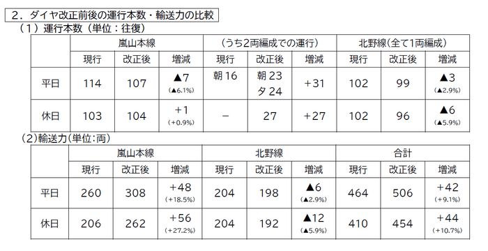 なお、今回のダイヤ改正により、嵐山線全体として輸送力を約10%増強することとなります。