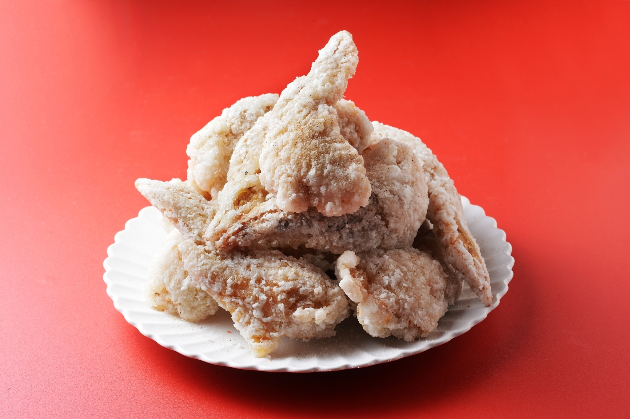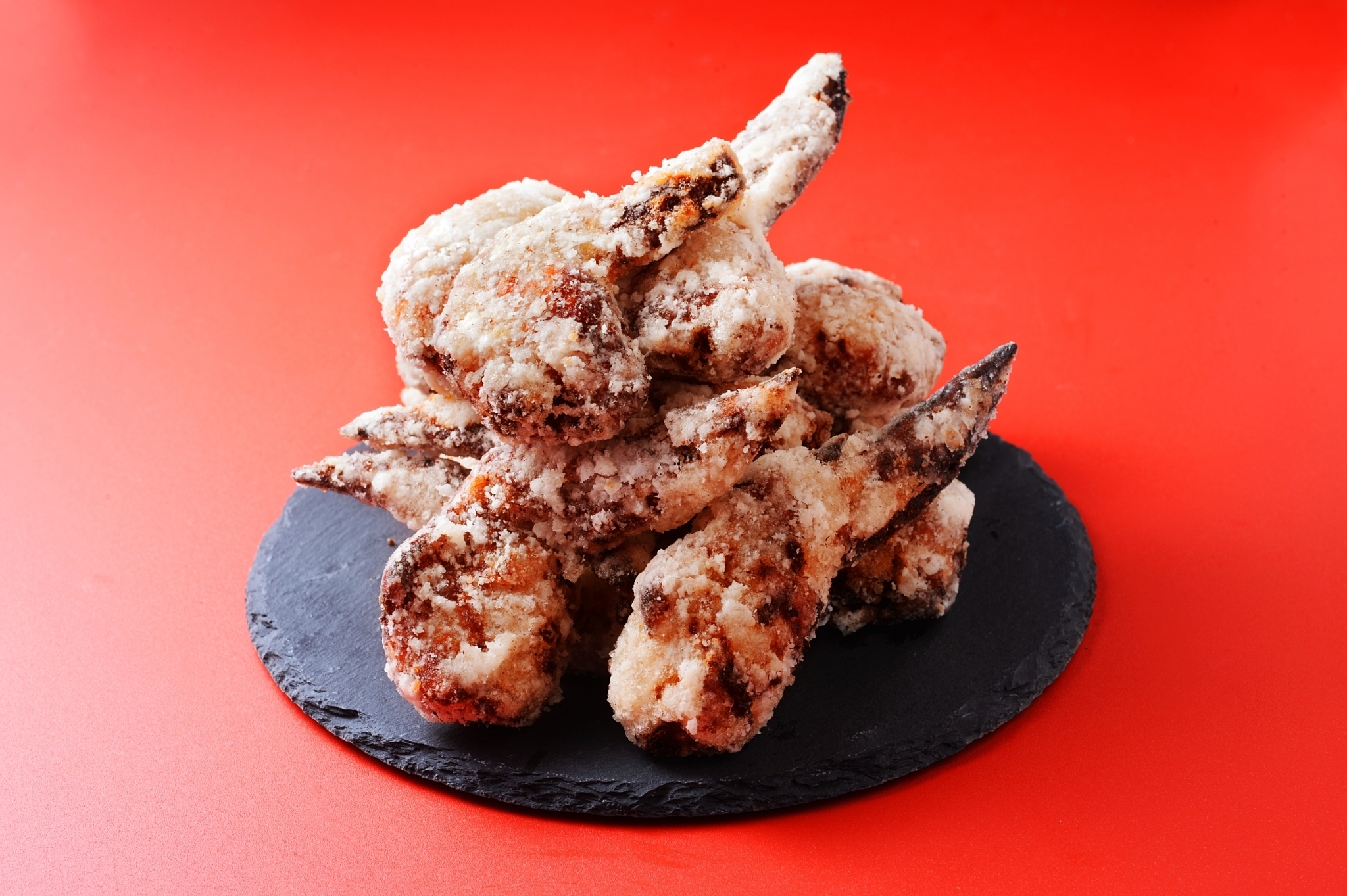 (秘伝のタレをベースに一度火を入れ、1日熟成した手羽先を唐揚げにしました。)