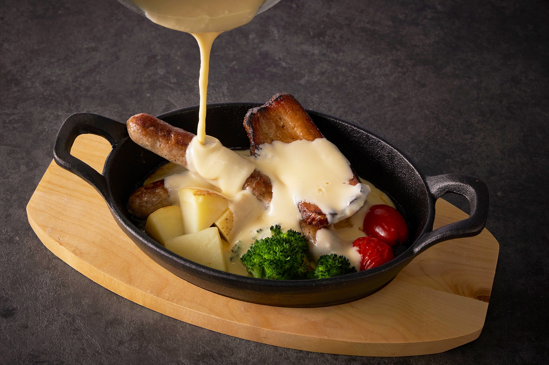 門倉ポークを使った自家製ソーセージとベーコンなどに、横浜ビール”ヴァイツェン”をブレンドしたオリジナルチーズソースをたっぷりかけた熱々”チーズシャルキュトリー”が登場!