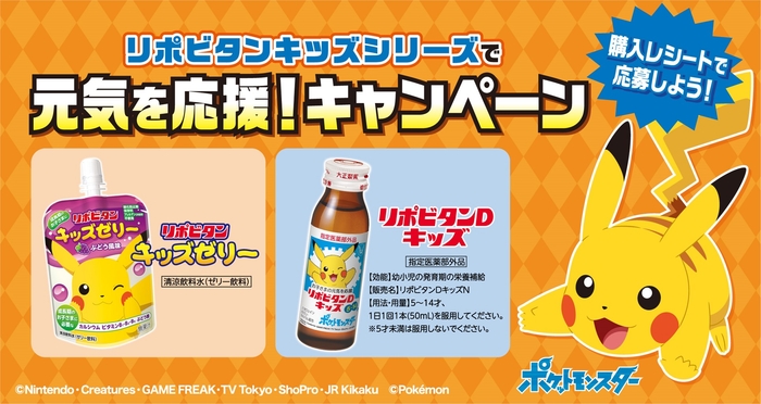 ■応募方法:キャンペーン期間中に対象品(リポビタンキッズゼリー各種、リポビタンDキッズ)を購入されたレシートを専用サイトにて登録またはハガキに添付して応募していただくことで、ポケモングッズが抽選で当たります。詳細は下記専用サイトでご確認ください
