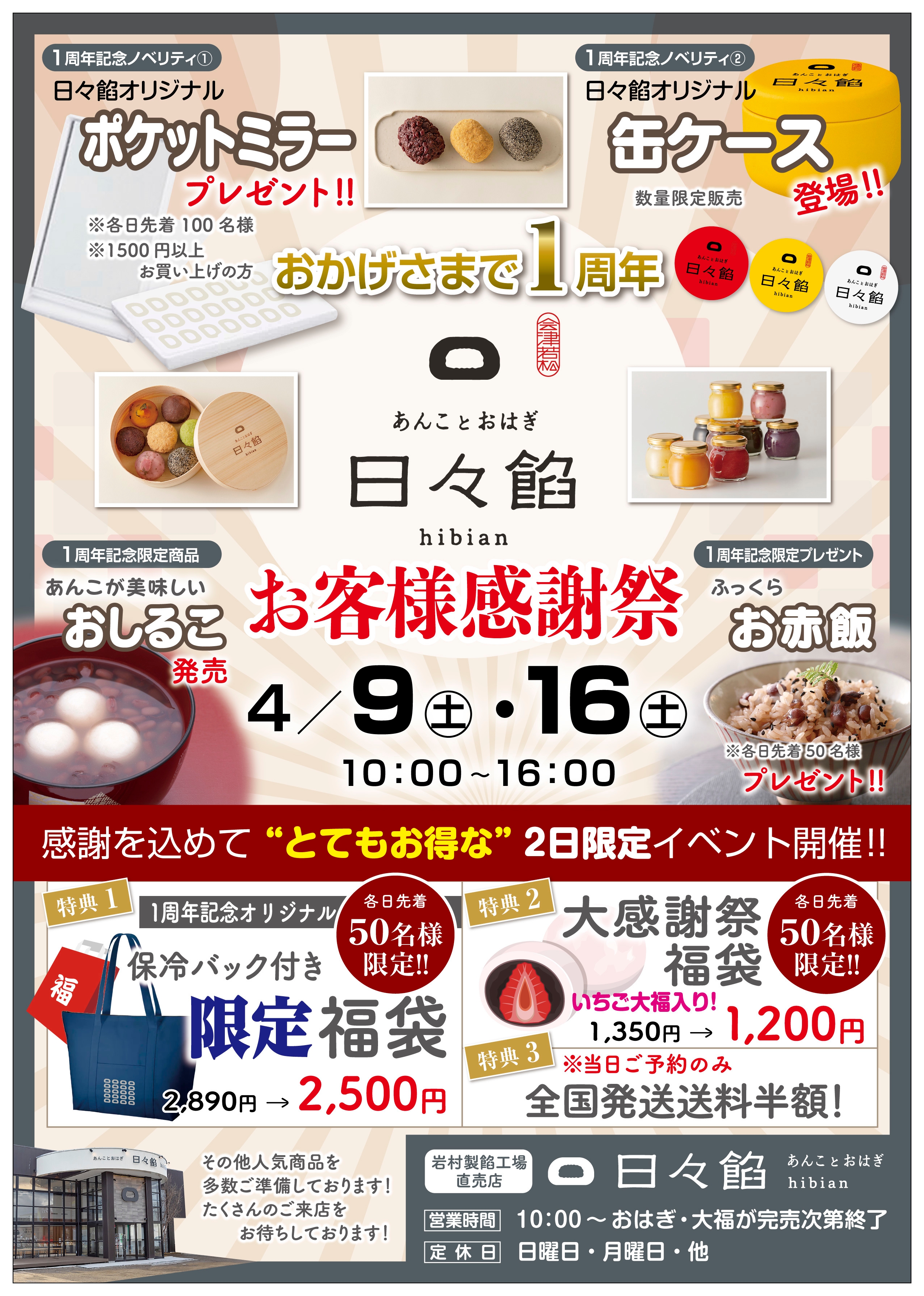 この1年間、地元会津若松市のお客様を中心に、福島県内のお客様にたくさんのご来店をいただき、「あんことおはぎ 日々餡」を支えていただきました。その感謝の気持ちを込めて、4月9日、16日の2日間にわたり“お客様大感謝祭”を開催いたします。