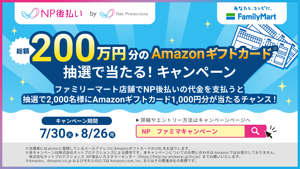 株式会社ファミリーマート(本社:東京都港区、代表取締役社長:細見研介)は、株式会社ネットプロテクションズ(本社:東京都千代田区、代表取締役社長:柴田紳、以下 ネットプロテクションズ)に協賛し、ネットプロテクションズの後払いサービスであるNP後払いで通販代金などをお支払いいただいた方を対象に「総額200万円分のAmazonギフトカードが抽選で当たる!」キャンペーンを2024年7月30日(火)~8月26日(月)まで全国のファミリーマート約16,300店舗にて実施いたします。