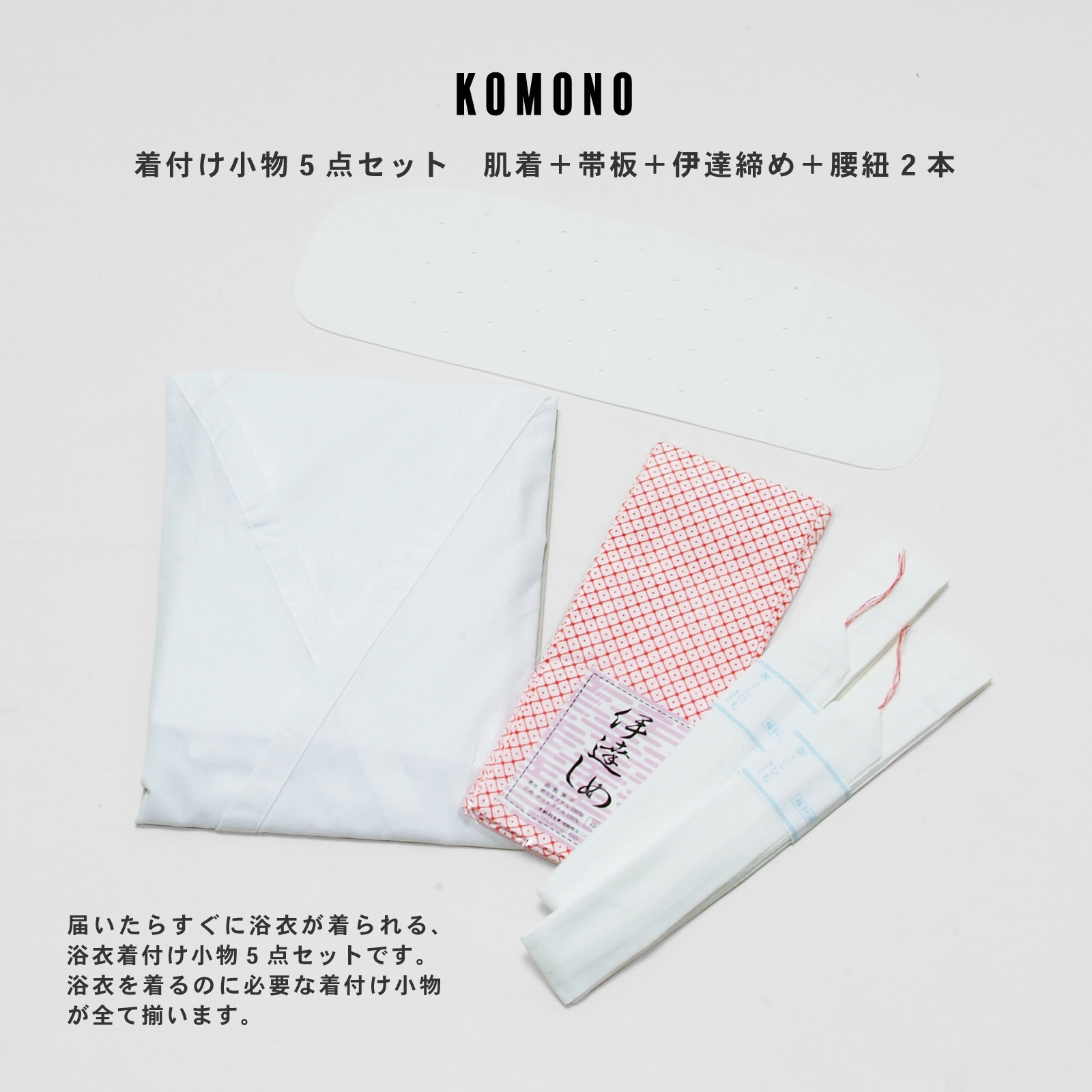 浴衣のみの販売です。帯や下駄、小物類は、それぞれ単品でお好みのものを購入いただいたり、お手持ちのアイテムを合わせて着用可能。