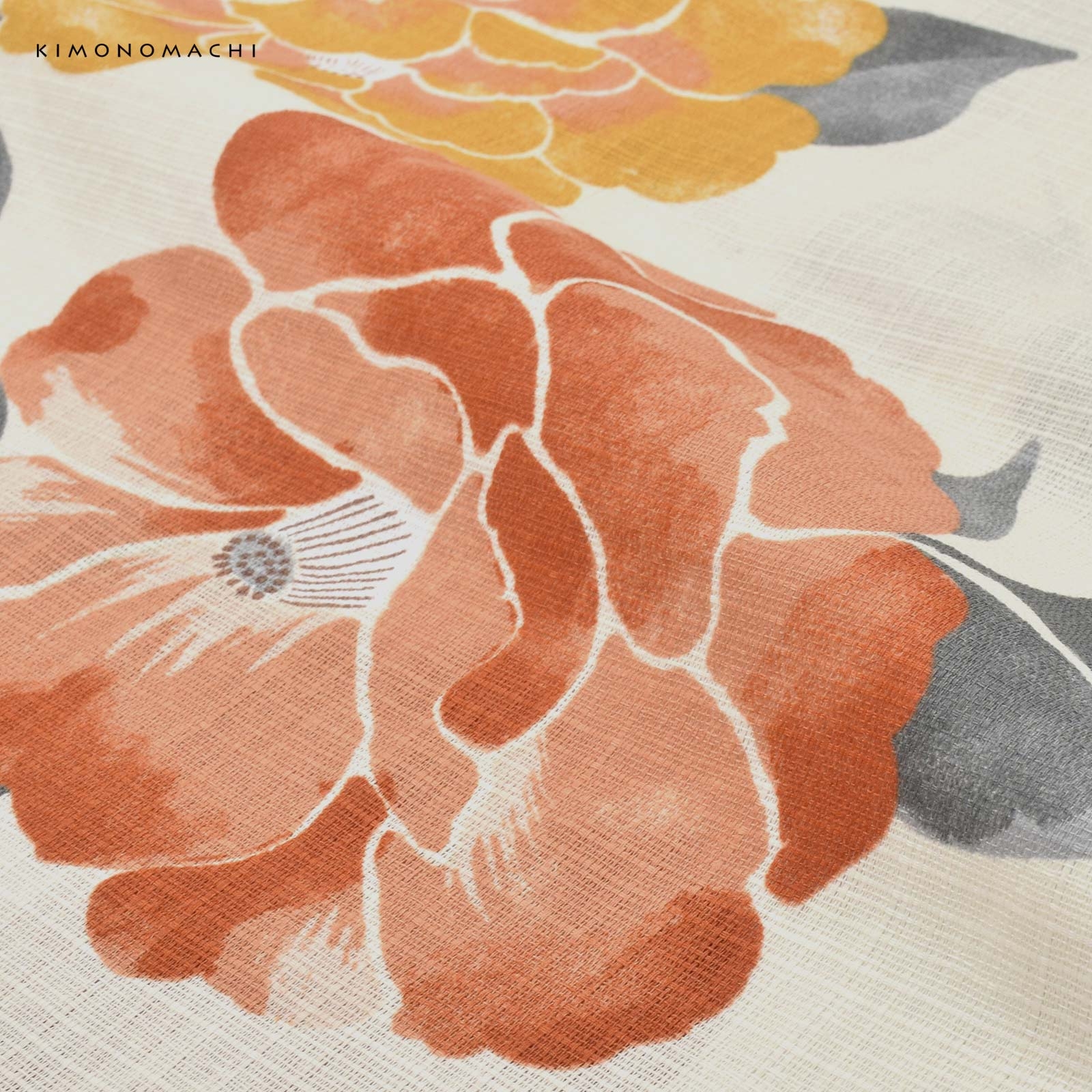 アイボリーの地に杏色と橙色、代赭色、白に杏色の絞りの入った椿の花。鈍いグレーの葉。ところどころかすれたような色合いと、輪郭線のない表現がレトロで懐かしい雰囲気です。