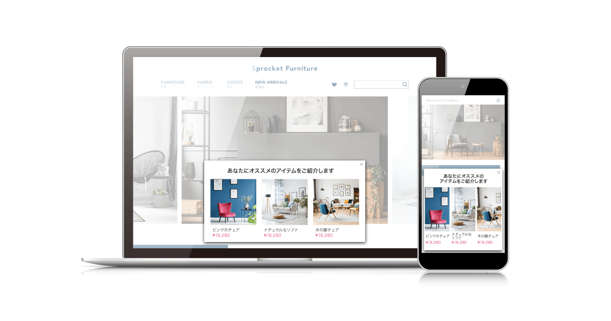 ECサイトで、購入経験があるユーザーが再訪した際に「本日あなたにオススメしたい商品です」というメッセージを添えて、購入履歴に関連する商品をポップアップで表示する