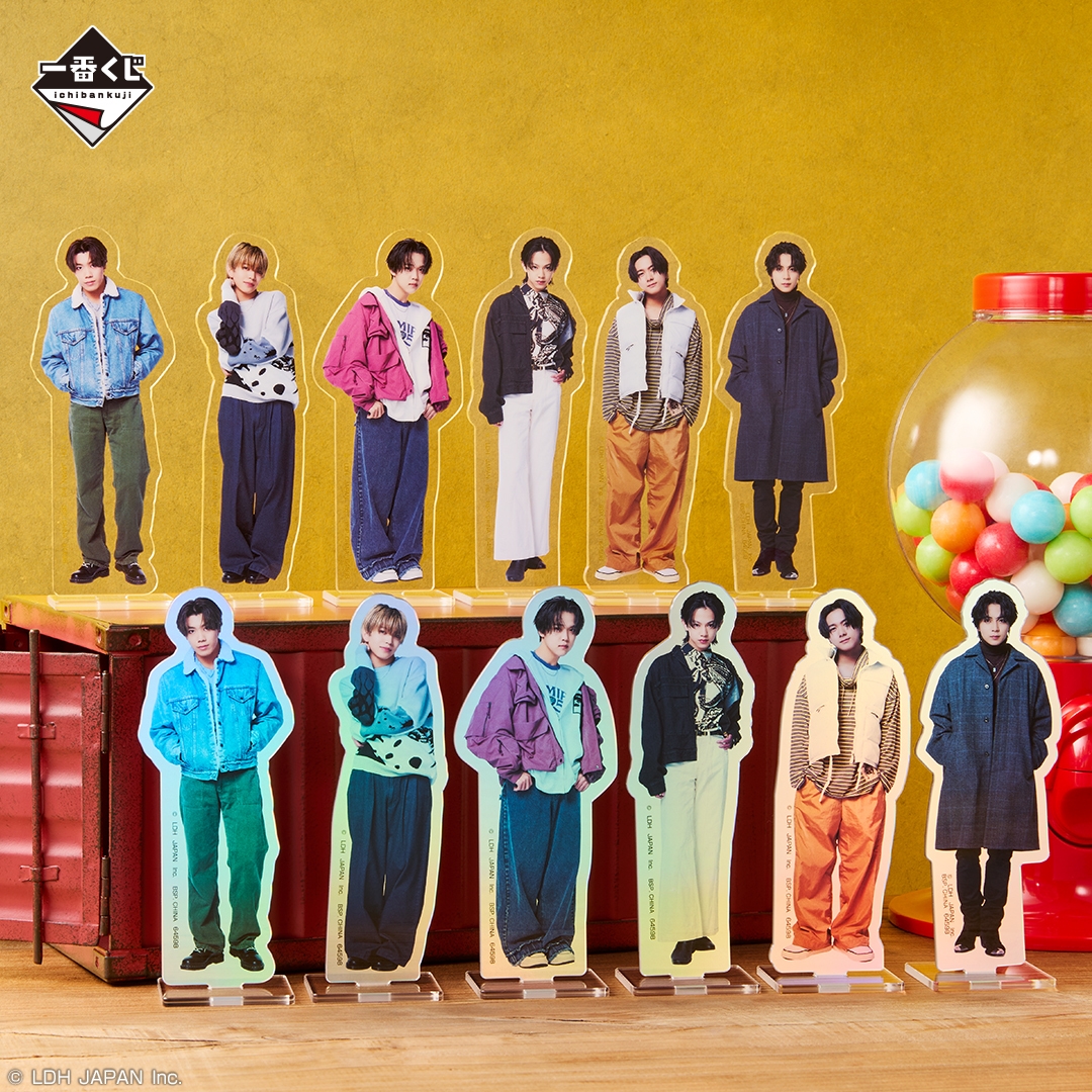 A賞はクールな表情の6人が揃った、立てかけられる仕様のアクリルボード。B賞からG賞は各メンバーのビジュアルスタンドです。表情違いで2枚セットになっているため、気分で付け替えることが可能です。そのほか、通常デザインとは別にオーロラ加工されたレア仕様も含まれているアクリルスタンドや、メンバーの名前や肖像画がデザインされたラバーストラップ、日常使いしやすいA4サイズのクリアファイルとスマホの裏に入れやすいサイズのステッカーセットなど、すべて一番くじ限定の撮りおろしカットを使用した、ファンにはたまらないアイテムをラインナップいたしました。