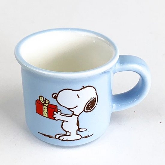 パステルブルーがきれいな、スヌーピーのマグカップ。プレゼントを渡すデザインもキュートです♡