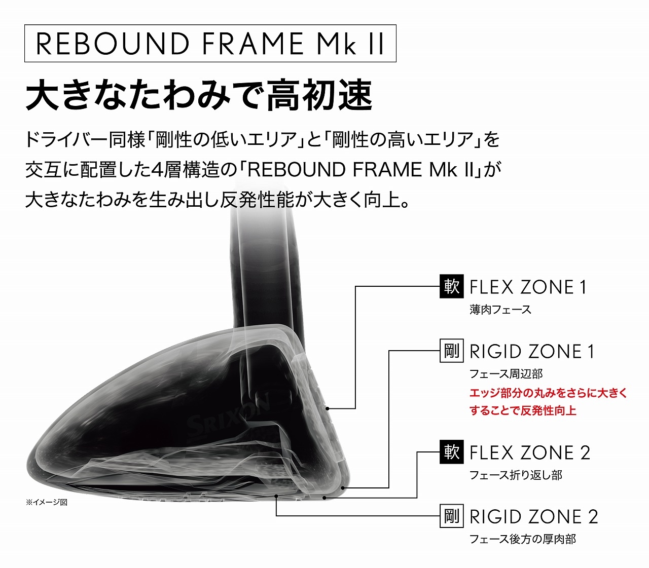 ボールをしっかりと受け止める「RIGID ZONE(リジッドゾーン)」(剛性の高いエリア)と、大きなたわみを生み出す「FLEX ZONE(フレックスゾーン)」(剛性の低いエリア)を交互に配置した4層構造の「REBOUND FRAME Mk Ⅱ」が大きなたわみを生み出すことでボールスピードアップを実現します。