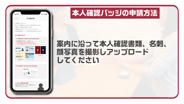 24時間営業のアクセアカフェでは、夜間、アプリBizSPOT(ビズスポット)で「本人確認済み」のユーザーのみが利用できます。「本人確認済み」ユーザーとは、アプリ上で運転免許証などの本人確認書類、名刺や顔写真などの書類を提出し運営側で審査が完了したユーザーを指します。
