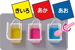 そのため今回のリニューアルでは、「あか・あお・きいろ」の3原色から、「オレンジ・みどり・むらさき」を作って楽しめるように設計を見直し、最大6色のふしぎ玉を作れるようにしました。色のバリエーションが一気に広がることで、見た目の楽しさも、体験の自由度も大きく向上しています。