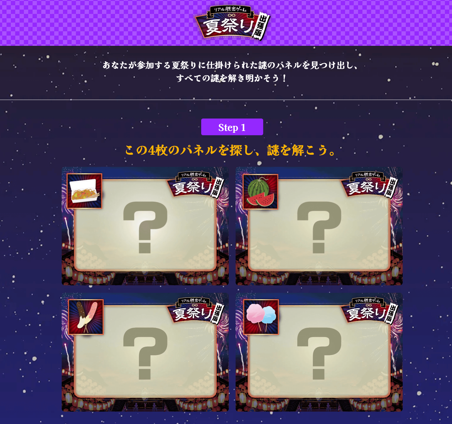 企画詳細ページよりお申し込みいただくと、実施にあたって必要なパネルデータとマニュアルが送られます。それらを元に夏祭り会場にパネルを掲示すれば準備完了! 謎解きの解答入力やヒント機能はWEB上に準備しておりますので、お手軽に企画を実施することができます。イベント来場者に向けて、謎解き企画でお祭りをさらに盛り上げるのはいかがでしょうか?