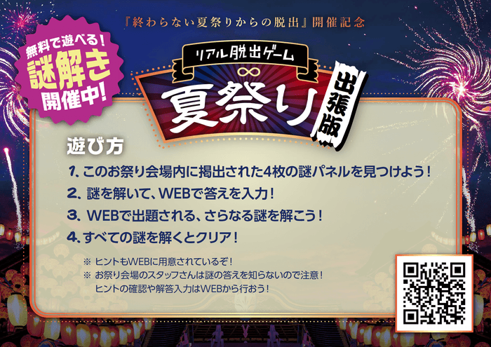 幕張メッセで2日間(全5公演)限定の開催となる『終わらない夏祭りからの脱出』開催にさきかげて、この「リアル脱出ゲーム夏祭り出張版」でいち早く謎解きが楽しめる本企画を、ぜひイベントの盛り上げにご活用ください。