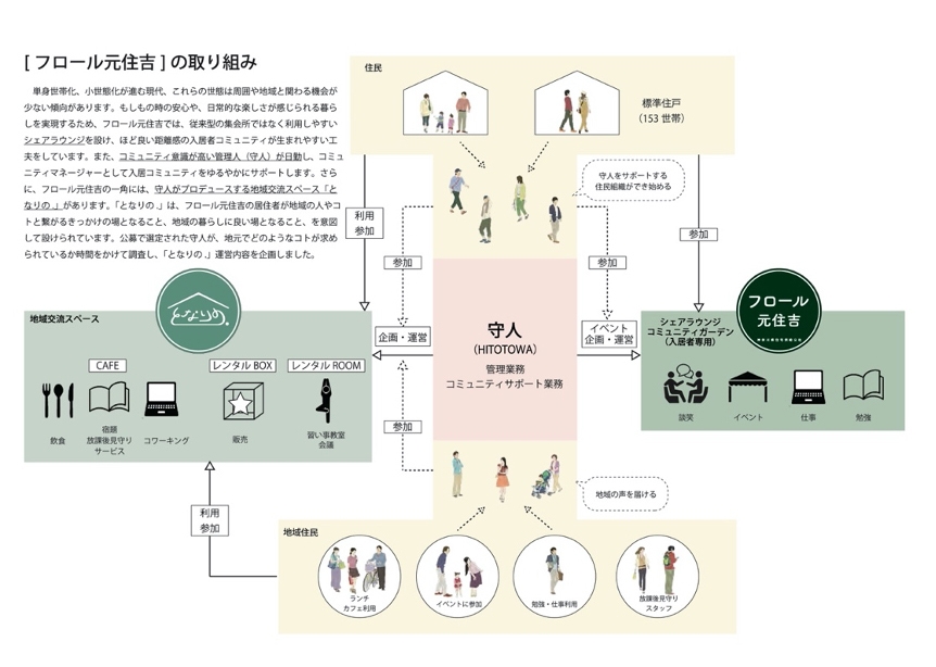 フロール元住吉は、築67年経過していた神奈川県住宅供給公社の賃貸住宅団地の建替事業で誕生しました。「自由だけど、ほど良い人付きあいがある」暮らしを実現することを目的として、入居者のコミュニティ醸成を担う管理員「守人(もりびと)」が昼間常駐しています。守人は日常の管理業務や見守りに加えて、入居者専用シェアラウンジや中庭で行うコミュニティイベントの企画運営も行っています。