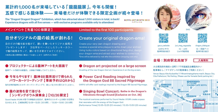 2021年に東京でスタートした「龍!龍!龍!」展は、2022年から別府に場所を移し、今年で5回目の開催となりました。総勢1,000名近くの龍好きなお客様が来場し、毎年恒例のイベントとなっています。今回は、龍の絵の展示に加え、龍の迫力をさらに体感してもらえるよう、プロジェクターを活用して魅せていきます。パワーあふれる龍神エネルギーをリアルに体感でき、パワーチャージできる、パワースポットのようなイベントです。この機会にぜひご来場ください。