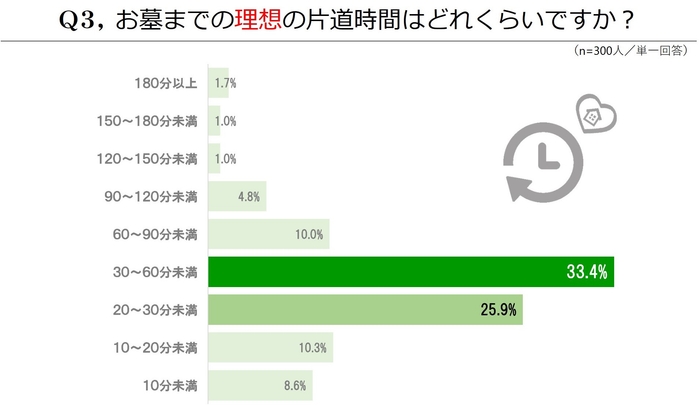 また、現状のお墓までの片道時間と、理想とする片道時間についても尋ねたところ、理想を 「30~60分」 とする人が最も多い一方で、実際には 「180分以上」 かかっている人が最も多いことも分かっています。