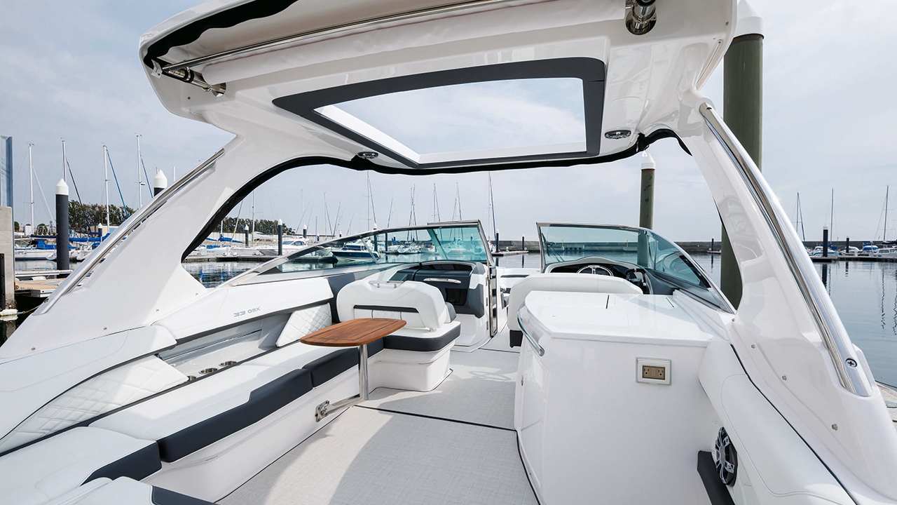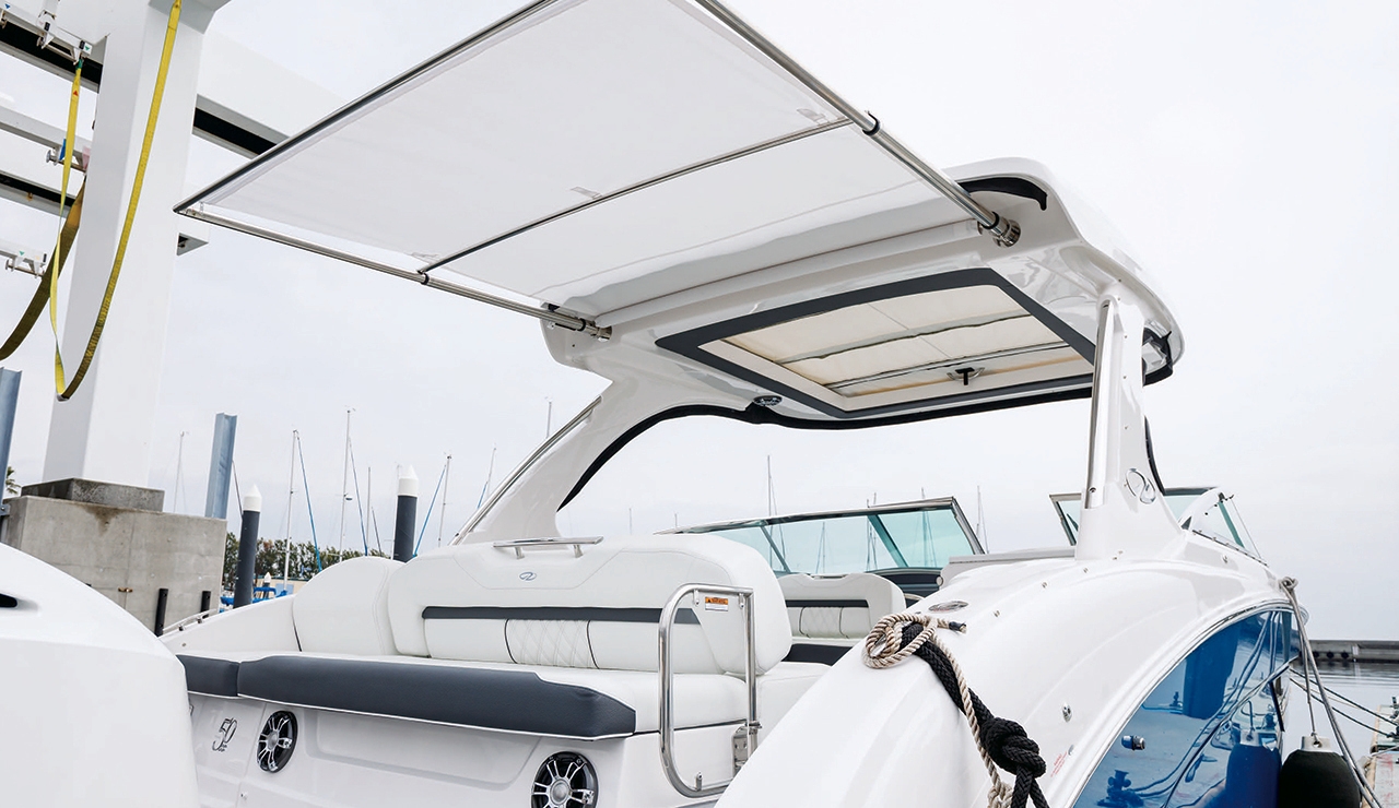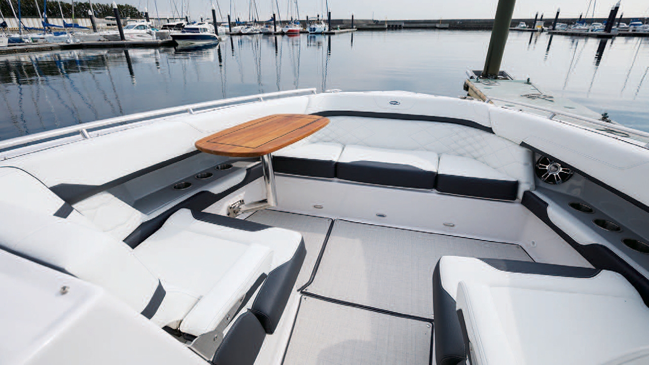 メインデッキには、多彩なアレンジが可能なラウンジソファに加え、ミニシンクやBBQグリルを装備し、ハードトップは、アフトデッキ全面をカバーする電動シェードも内臓。オープンなバウデッキをラウンジエリアとして活用できるなど自在な楽しみ方が可能で、ゲストにも快適なボート体験をもたらします。