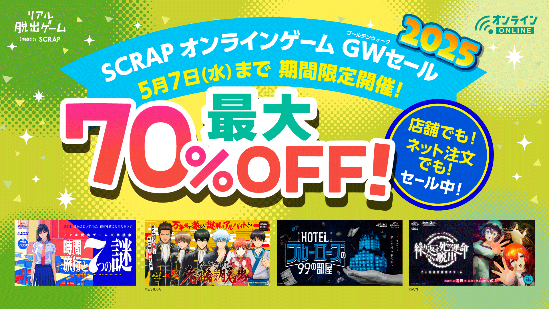 全世界で累計1,490万人以上を動員しているリアル脱出ゲームを企画制作する株式会社SCRAP(本社:東京都渋谷区、代表:加藤隆生)は、2025年4月23日(水)〜5月7日(水)の15日間限定で、自宅で遊べるオンラインゲームを対象とした「SCRAPオンラインゲーム GWセール2025」を開催いたします。