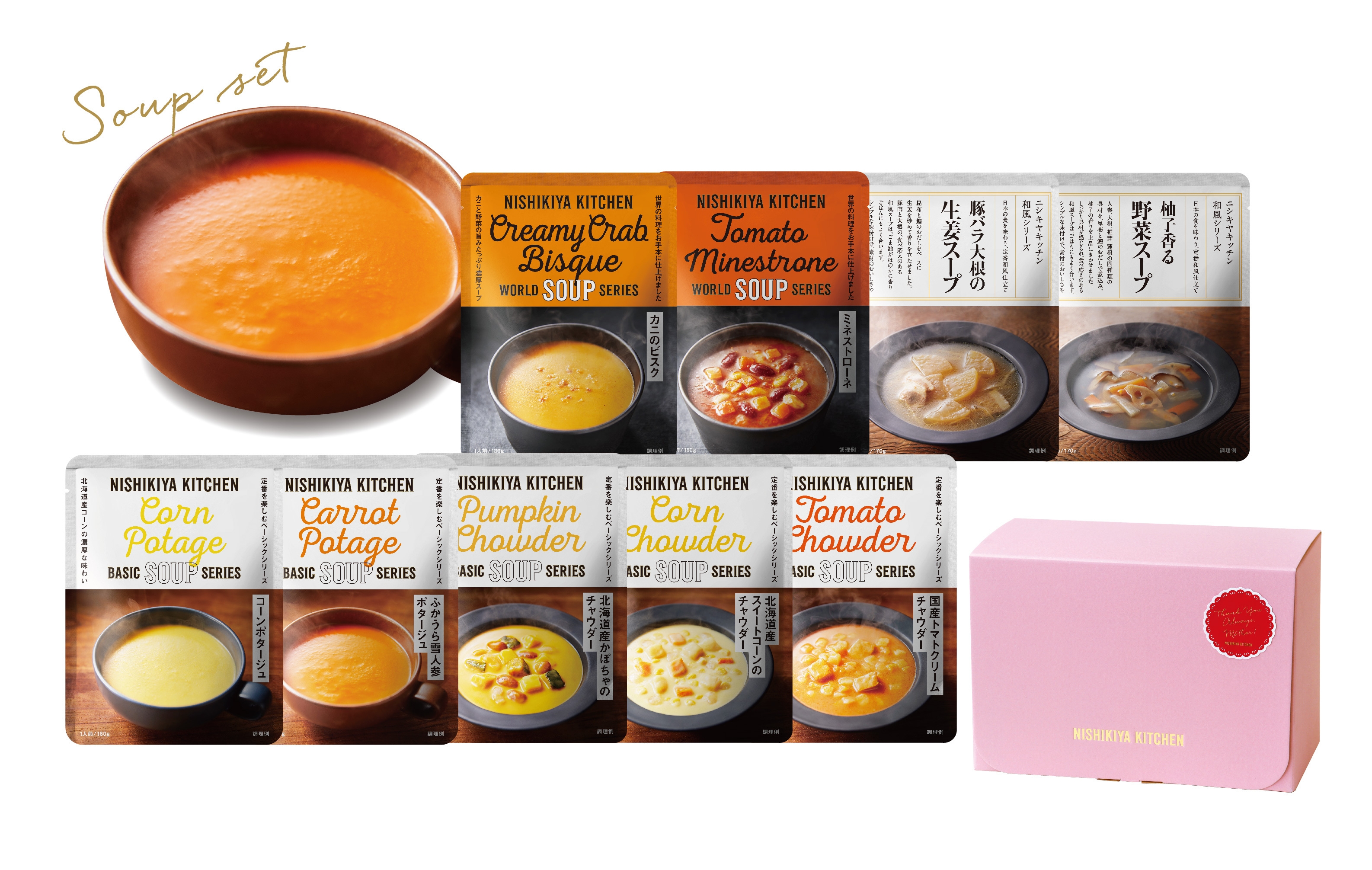 NISHIKIYA KITCHEN(ニシキヤキッチン)(株式会社にしき食品 本社:宮城県岩沼市、代表取締役:菊池 洋)は、2024年4月11日(木)より、公式オンラインショップにて、母の日ギフトセット3種を発売いたします。ニシキヤキッチンの母の日ギフトは、毎日忙しく過ごすお母さんにほっと一息つく大切な時間をお届けできればとの想いで、スタッフがカレーやスープをセレクトしました。淡いピンク色の限定ギフト箱に入れてお届けします。また、公式オンラインショップ限定の「世界にひとつだけのメッセージカード」に贈り主様のメッセージと写真を入れ、ギフトと一緒にお届けすることで、普段なかなか伝えられない感謝の気持ちを伝えるきっかけになっていただきたいと思います。