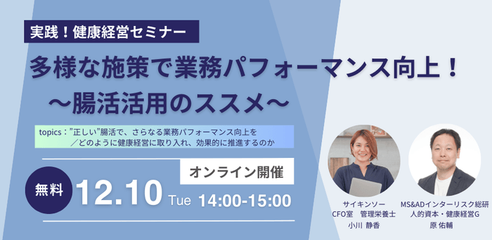 視聴無料「<実践!健康経営セミナー>多様な施策で 業務パフォーマンス向上!~腸活活用のススメ~」12/10(火)開催