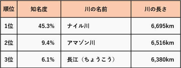 続いて、川の長さの世界一がわかると答えた人は45.3%となりました。2位から先になると10%未満になっています。