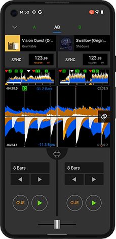 それぞれ独立したA/Bの2つのデッキによって、2曲分のブラウズとCUE/GRIDなどの設定を同時に行うことができます。それぞれのデッキの1 PLAYERモード、および2 PLAYERモードはフリック操作で簡単に行き来できるので、柔軟かつ効率的な楽曲の相性確認と仕込みを行うことができます。