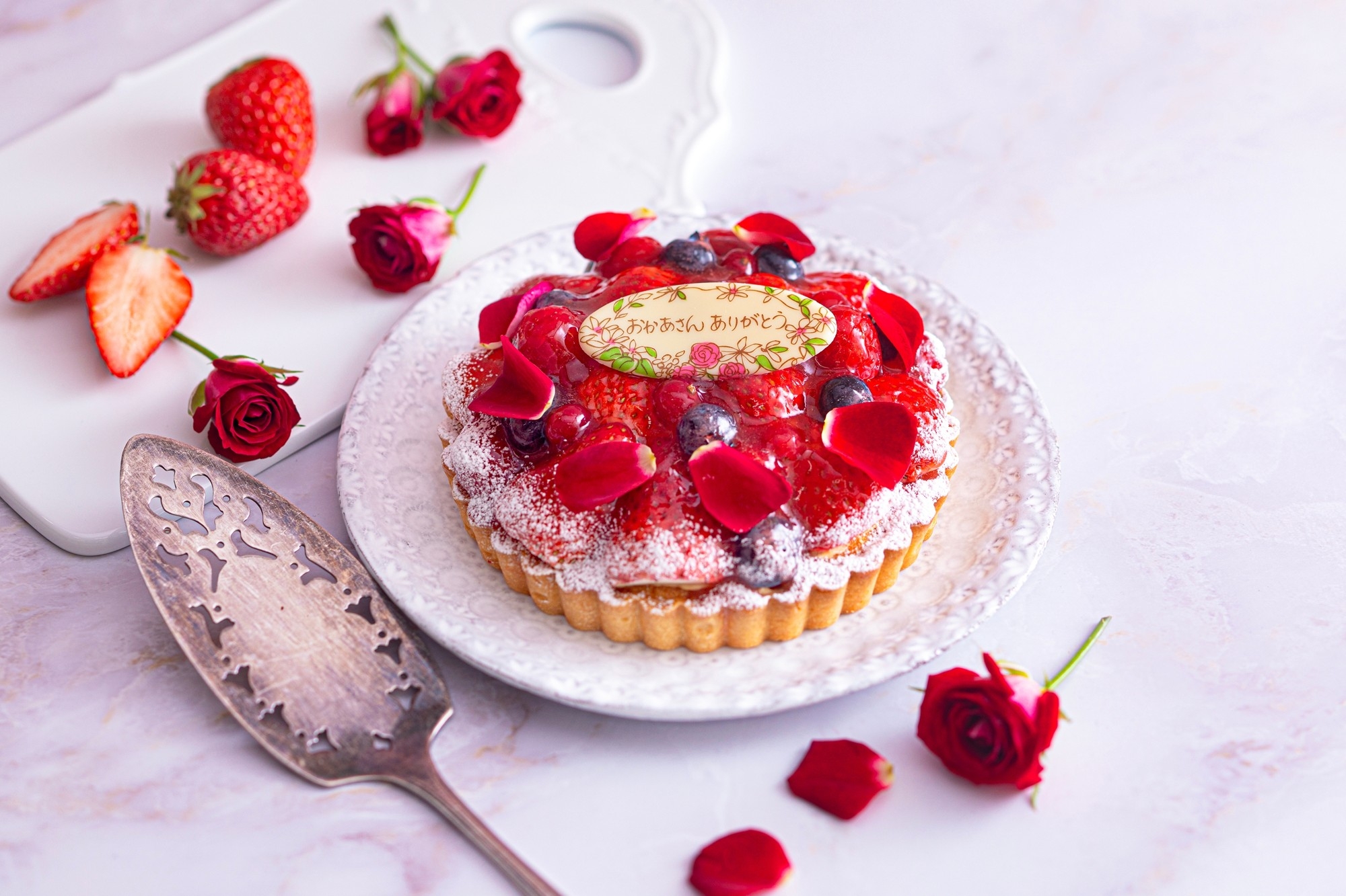 華やかなローズの花びらを飾った母の日限定タルトです。